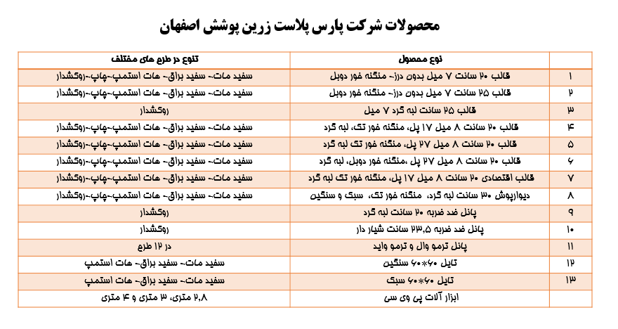 دیوارپوش های شرکت پارس پلاست در ابعاد و طرح های مختلف به شرح زیر تولید و عرضه میشوند: